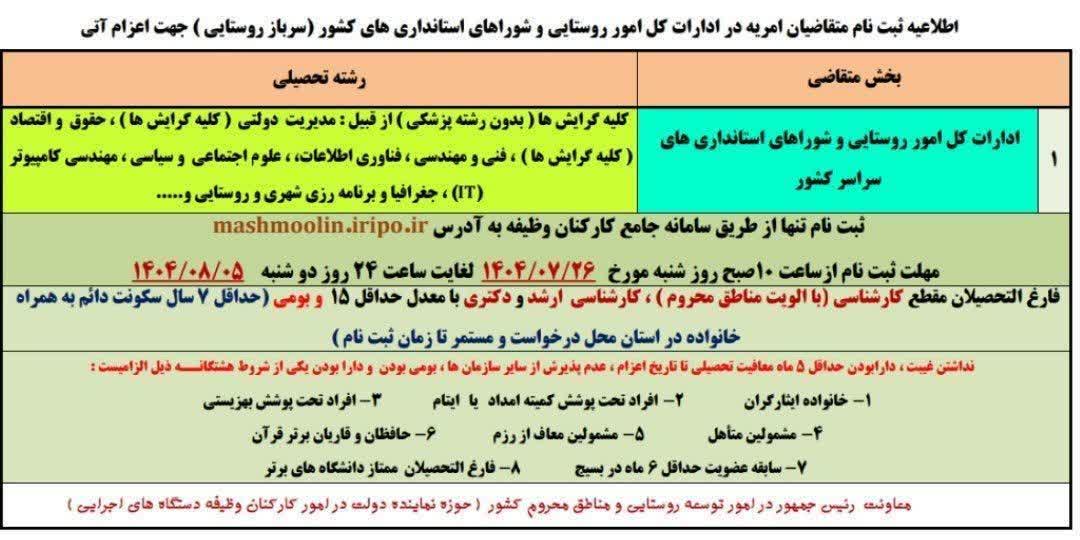فراخوان ثبت‌نام امریه سربازی در اداره‌کل امور روستایی و شوراهای استانداری لرستان اداره‌کل امور روستایی و شوراهای استانداری لرستان در راستای بهره‌گیری از ظرفیت‌های تخصصی جوانان تحصیل‌کرده، از متقاضیان واجد شرایط برای خدمت سربازی در قالب امریه دعوت به ثبت‌نام...